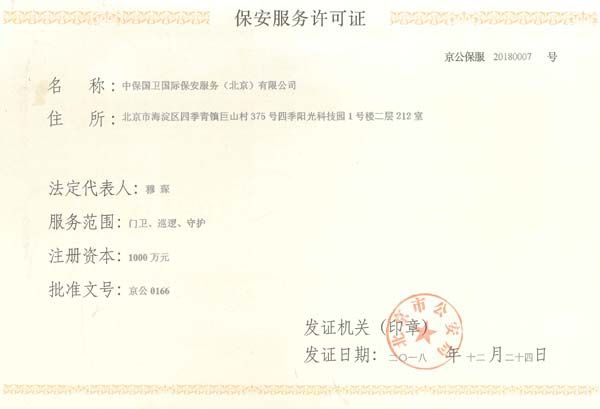 中保國衛(wèi)國際保安服務(wù)(北京)有限公司,屬中保國衛(wèi)集團(tuán)旗下子公司。能全方位的為大型客戶提供優(yōu)質(zhì)的安保、押運(yùn)服務(wù),是集人防和技防于一體的新型正規(guī)化綜合安保押運(yùn)服務(wù)企業(yè),提供人防、物防、技防、聯(lián)網(wǎng)報*、非武裝押運(yùn)等安防相關(guān)的一站式服務(wù)。